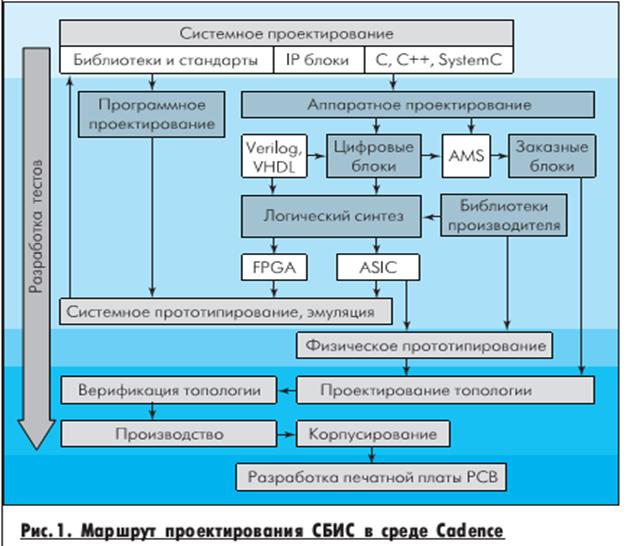 Технология Cadence охватывает практически все уровни разработки сложных систем – от системного уровня, свойственного разработчикам аппаратуры, до уровней логического, схемотехнического и топологического проектирования СБИС, их корпусирования, а также разработки печатных плат, на которых эти СБИС будут монтироваться. В целом проектирование СБИС в среде Cadence включает следующие этапы: • системное проектирование – построение модели системы на высоком уровне абстракции с использованием языков программирования C/C++ и SystemC, разбиение на программные и аппаратные модули, исследование параметров системы, получение спецификаций (набора требуемых параметров) на программные и аппаратные блоки; • аппаратное проектирование и верификация – разработка на основе спецификации поведенческих моделей отдельных блоков системы с использованием языков Verilog/VHDL, реализация проекта в базисе библиотек производителя ИС, проверка программно-аппаратной реализации на соответствие спецификациям, полученным на системном уровне; • физическое прототипирование – предварительное размещение элементов, оценка потребляемой мощности, планирование шин питания и иерархии тактовых сигналов, качественная оценка возможных искажений сигнала; • проектирование и верификация топологии кристалла – разработка топологии заказных блоков, трассировка на уровне ячеек, проверка правил проектирования топологии, экстракция паразитных параметров.