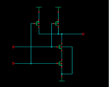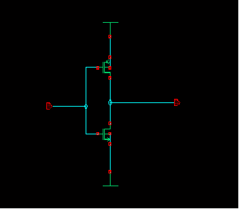 Раздел 3 “Иерархический подход в проектировании ИМС ” Исходным элементом при проектировании были выбран МДП-транзисторы p-n - типа с встроенным каналом Использование графического редактора Cadence Composer Schematic Editor, является традиционным для описания проектируемого устройства на транзисторном уровне. Редактор предоставляет возможность визуального размещения основных компонентов схемы (транзисторов, диодов, конденсаторов, катушек индуктивности), вспомогательных компонентов (источников постоянного тока и напряжения, источников малых сигналов), а также контактов (пинов), использующихся при иерархическом представлении сложных схем, и соединения элементов между собой. Результатом работы в Composer Schematic Editor является создание таблицы соединений схемы, записи которой служат в дальнейшем входными данными для других инструментов САПР Cadence. Очевидно, что на следующих этапах разработки устройства может потребоваться изменение начального представления схемы. В этом случае будут откорректированы и записи таблицы соединений. Рассмотрим реализацию логических элементов с использованием NMOS-транзисторов и PMOS-транзисторов. На рисунке 2а представлены их принципиальные электрические схемы. Когда сигнал Vx=0V, NMOS транзистор закрыт. Поэтому ток через резистор R отсутствует, и на выходе Vf=5V. С другой стороны, когда Vx=5V, транзистор открыт и на выходе Vfустанавливается низкий уровень напряжения. Точное значение напряжения на выходе Vfв этом случае зависит от величины тока, протекающего через резистор и транзистор. Использование резистора в схеме инвертора обусловлено необходимостью ограничить ток, протекающий в цепи при Vx=5V. В интегральной схемотехнике в качестве такого ограничителя обычно используется транзистор.Используя последовательное соединение NMOS-транзисторов, как показано на рисунке 2б, можно реализовать логический элемент И-НЕ. Если Vx1=Vx2=5V, оба транзистора будут открыты и Vfбудет равен 0V. Но если либо Vx1, либо Vx2=0, то ток в цепи будет отсутствовать и Vfбудет равен 5V.