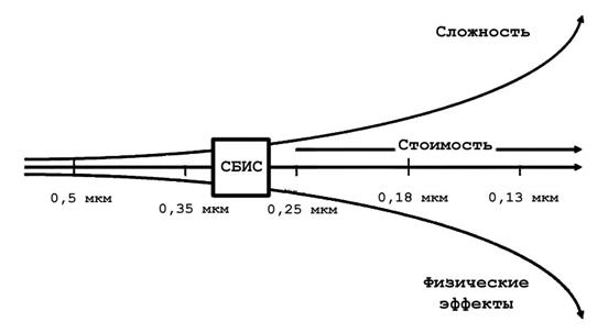 Раздел 5 «Достижение предела классических подходов с использованием ОДУ. Пути решения кризиса» Классические программы моделирования аналоговых электронных схем, обеспечивают хорошую сходимость решения в большинстве случаев и гарантируют достаточную точность. Однако, постоянный рост сложности и объемов проектов БИС привел к увеличению размеров схем до десятков и сотен миллионов узлов. Как следствие, производительность классических программ моделирования, построенных на традиционном подходе составления и решения системы ОДУ с применением методов разреженных матриц, стала явно недостаточной для решения системы уравнений, описывающей всю схему. Подходы, применявшиеся несколько лет назад, состоят в расчете фрагментов схем, базовых ячеек или в комбинированном применении логических и временных расчетов совместно с моделированием аналоговых фрагментов схем на уровне транзисторов. Широкое распространение нашло также макромоделирование. В последние годы, интенсивно начали развиваться программы моделирования нового поколения, так называемые «быстрые симуляторы». Их применение дает качественный скачок в производительности. Появилась возможность моделировать БИС объемом в десятки и сотни миллионов узлов с точностью и требованиями к вычислительным ресурсам, близкими к традиционным программам моделирования. Решение, предлагаемое Cadence на данном сегменте рынка, - платформа Virtuoso и система FastSPICE Ultrasim. Наряду с известными системами моделирования, Ultrasim интегрирован в общую среду разработки Virtuoso и дает возможность быстро получить решение с приемлемой точностью при возрастании сложности проекта на несколько порядков. Технические требования к аналоговым, заказным цифровым, радиотехническим и смешанным проектам росли экспоненциально в последнее десятилетие (рис. 2). Экономические факторы и конкуренция на рынке электроники вынуждают разработчиков применять новые технологии и объединять прежде независимые блоки на одном кристалле (System-On-Chip, SOC). Многие производители переходят на современные технологии проектирования по нормам 0.13 мкм – 65 нм, и совмещают аналоговое проектирование, с нанометровыми цифровыми дизайнами. Более того, основой цифрового проектирования является использование библиотек стандартных и специализированных заказных блоков, разрабатываемых с применением средств аналогового моделирования.