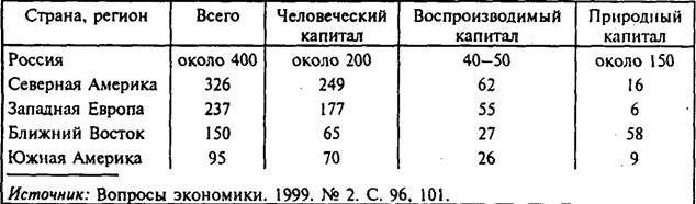 Еще один метод оценки национального богатства, разработанный Всемирным банком, включает три составные части — человеческий, природный и воспроизводимый капитал. Предложенные экспертами Всемирного банка общие методологические принципы оценки базируются на том, что все элементы национального богатства имеют одинаковый срок службы — 25 лет, а их ежегодный износ — 4%. Для оценки природного капитала используются данные о ренте (земельной, лесной, горной и прочих видах), капитализированной за последние 25 лет, что позволяет определить полную восстановительную стоимость запасов большей части важнейших видов природных ресурсов с учетом их истощения. Оценка накопленного воспроизводимого капитала (основного производственного и непроизводственного капитала, оборотного капитала, домашнего имущества) осуществляется на основе данных о валовых внутренних и чистых иностранных инвестициях за 25 лет. Значения полученных показателей накопления воспроизводимого капитала пересчитываются из национальных валют в доллары по современным ценам по паритету покупательной способности (ППС) валют, т.е. стоимости в американских ценах основных групп товаров и услуг данной страны. В понятие человеческого капитала включаются текущие расходы семей и государства на питание, одежду, содержание жилища, образование, здравоохранение, культуру, досуг и иные потребности людей за 25 лет. Сравнительные данные оценки национального богатства по методике Всемирного банка приведены в табл.
