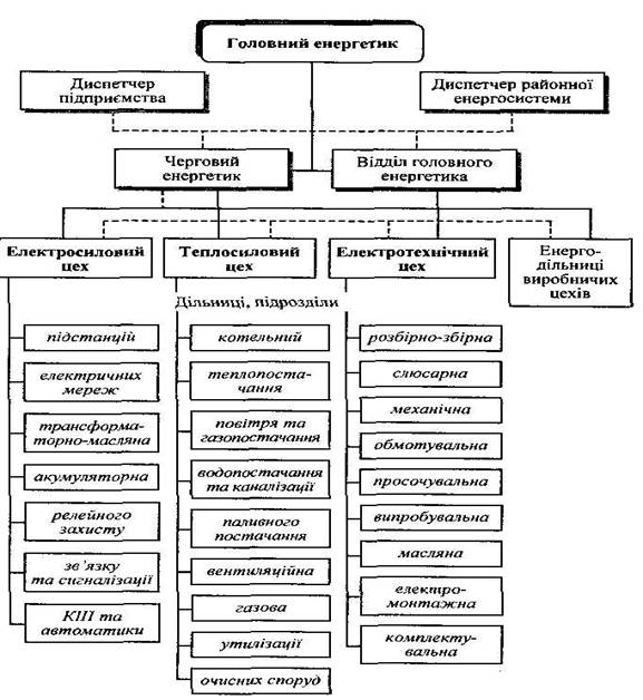 1. Відділ головного енергетика (на чолі з головним енергетиком, який керує всією системою енергетичного господарства підприємства). Структура цього відділу включає: ¾ бюро використання енергії, що розробляє норми і планує енергопостачання; ¾ оперативно-диспетчерське бюро, яке здійснює оперативне управління всією системою енергопостачання та енергозабезпечення підрозділів, займається збиранням, аналізом інформації й виконує інші функції; ¾ технічне бюро організовує, керує ремонтом електромереж, енергоустаткування загальнозаводського призначення, наглядає за їх роботою; ¾ енергетичні лабораторії, які розробляють і впроваджують заходи для підвищення ефективності роботи енергогосподарства, енергозбереження, зниження енергоємності виробничих процесів і продукції.