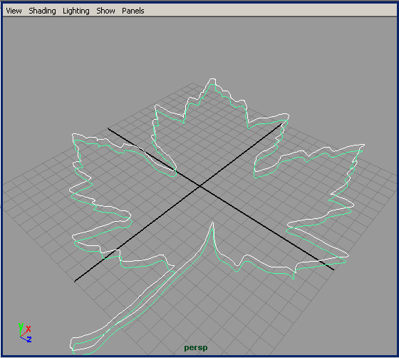 Рассмотрим ситуацию применения лофтинга для закрытия отдельного фрагмента объекта на примере получения объемной модели кленового листа. Для начала потребуется создать контур листа — вручную либо на основе имеющегося растрового изображения. Мы пойдем по второму пути: загрузите снимок (рис. 30) в окно проекции Top (команда View => Image Plane => Import Image из меню окна проекции) и обведите его (рис. 31). Замкните контур при помощи команды Edit Curves => Open / Close Curves (Редактирование кривых=>Открыть/Закрыть кривую). Сделайте его копию, выделите оригинальный и скопированный контуры (рис. 32) и примените к ним операцию Loft — в итоге будет получена боковая поверхность листа, придающая ему объем (рис. 33). Затем на основе оригинальной кривой инструментом Planar (команда Surfaces => Planar — Поверхности=>Планарный) смоделируйте две плоские поверхности, разместите первую из них в качестве верхней плоскости листа, а вторую — в качестве нижней. Назначьте объектам сцены материалы и проведите рендеринг (рис. 34).
