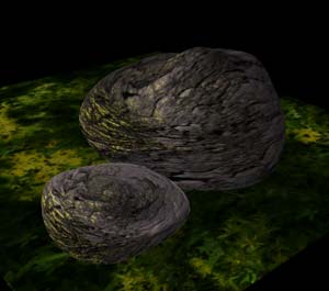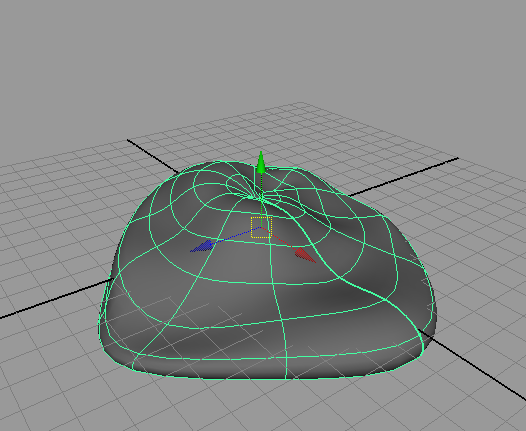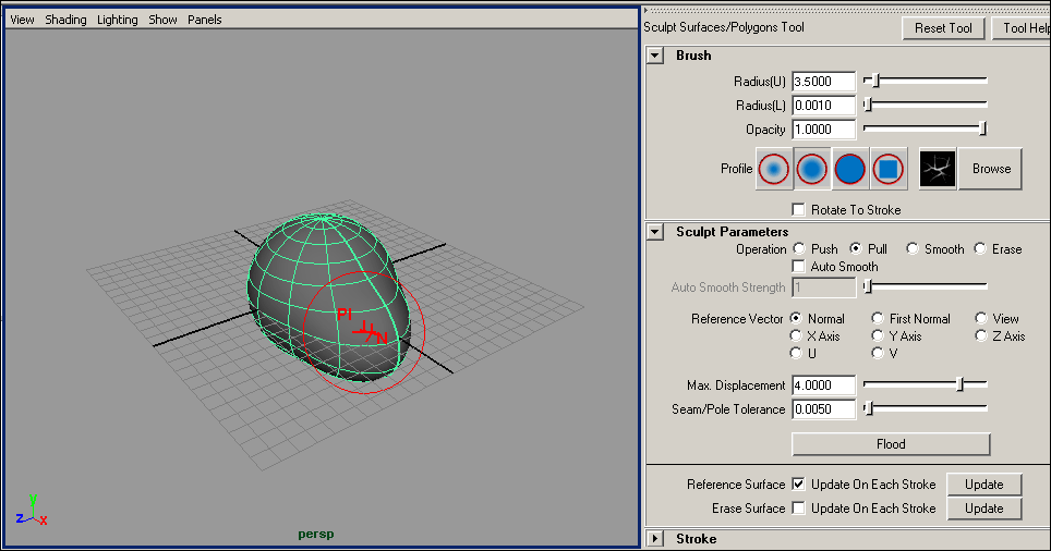 Для того чтобы разобраться с принципом применения инструмента Sculpt Surfaces Tool, проведем вначале простой эксперимент и попробуем получить из сферы обычный булыжник. Создайте NURBS-сферу, в окне каналов Channel Box установите ее размер равным 5 (параметры Scale X, Scale Y и Scale Z) и увеличьте количество вертикальных (Sections) и горизонтальных изопарм (Spans) до 12. Выделите сферу и щелкните на квадратике справа от команды Edit NURBS => Sculpt Surface Tool (Редактирование NURBS-поверхностей=>Создание рельефа). Установите режим работы Pull, увеличьте максимальный радиус (Radius U) и максимальное смещение (Max Displacement) и немного вытяните сферу в одном из направлений, перемещая мышь при нажатой левой клавише (рис. 81). Переключитесь с режим Push, уменьшите глубину воздействия инструмента и поэкспериментируйте с формированием вмятин, затем вновь вернитесь в режим Pull и окончательно доработайте объект, чтобы он действительно стал напоминать булыжник (рис. 82). Создайте вторую сферу и превратите ее в булыжник аналогичным образом, разместите оба булыжника на плоскости (рис. 83), а затем назначьте им подходящие материалы — возможный результат представлен на рис. 84.