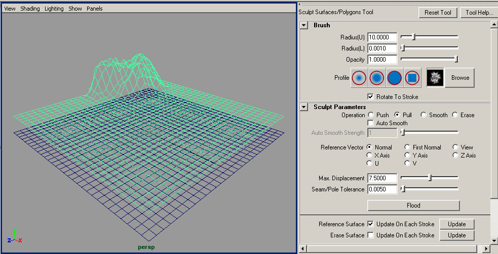 Выделите верхнюю плоскость, откройте окно Sculpt Surface, установите режим Pull с большими значениями параметров Radius U и Max Displacement, загрузите кисть Follage и смоделируйте первый скальный массив (рис. 90), добавьте в сцену еще один-два массива примерно того же размера (рис. 91). Уменьшите значение максимального радиуса и максимального смещения, установите кисть SkinBump и дополните картину высокой скалой (рис. 92). Отмасштабируйте деформированную плоскость по своему усмотрению (рис. 93).