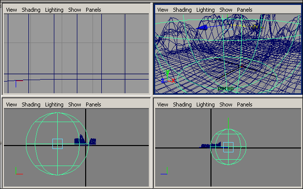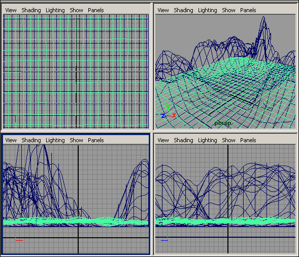 Попробуем создать простой ландшафт, представляющий собой скалистое побережье. Основой ландшафта станут две NURBS-плоскости и NURBS-сфера. Для начала создайте плоскости (обе с 30 вертикальными и горизонтальными изопармами) и разместите одну над другой (рис. 89) — из верхней будем генерировать горный ландшафт, а нижнюю превратим в водную поверхность.