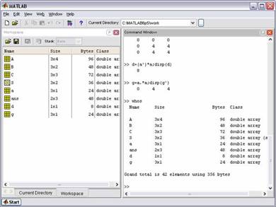 Таблица на рис. 6 иллюстрирует две важных особенности MATLAB: 1. MATLAB различает имена, набранные в разных регистрах. 2. В MATLAB векторы и скалярные переменные трактуются как матрицы размера [1 m], [n 1] и [1 1].
