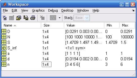Пояснения: а) вместо выражения S(i)=-3.0./(N(i)+3)+3/2 для i=1,2,3,4 мы написали S=-3.0./(N+3)+3/2; это обычная практика в MATLAB – если в выражении участвует вектор, последовательно вычисляются значения для всех элементов вектора; б) обратите внимание, написано -3.0./..., а не -3.0/.... Дело в том, что в MATLAB определены операции сложения или разности вектора с числом, но не определена операция деления числа на вектор [(N+3) есть вектор]; для таких случаев существует операция поэлементного деления./ (точка+слэш); как мы узнаем позднее, такие же особенности присущи и некоторым другим арифметическим операциям с участием векторов.