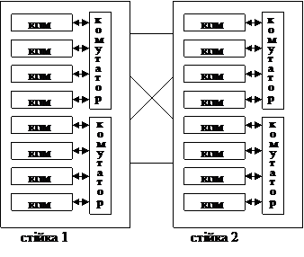 Рис. 17. Приклад ПК при повній конфігурації HP Superdome Самі комутатори зв’язані між собою, а також мають по одному порту для розширення системи. Швидкість обміну даними – 8Гб/с. Кожен комутатор має ще додатковий порт для подальшого розширення системи. Одним із центральних питань в архітектурі Numa є різниця в часі звернень. В даних комп’ютерах є три види затримки: 1. процесор і пам’ять знаходяться в одній комірці, час звернення мінімальний; 2. процесор і пам’ять знаходяться в різних комірках, які під’єднані до одного комутатора, час звернення середній; 3. процесор і пам’ять розміщені в різних комірках, які під’єднані до різних комутаторів, час затримки максимальний.