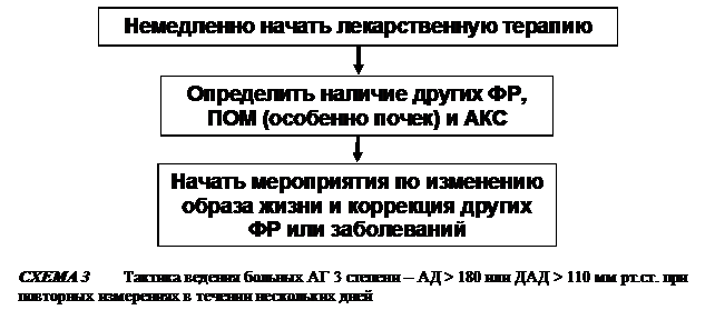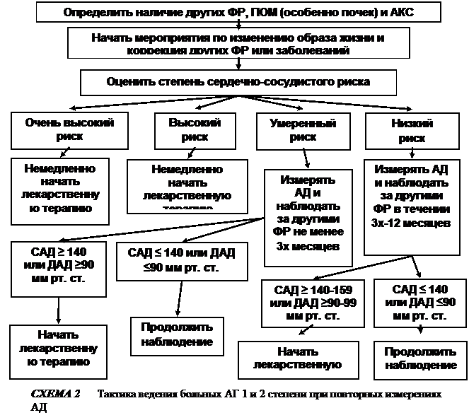 Общие принципы ведения больных. После оценки сердечно-сосудистого риска вырабатывается индивидуальная тактика ведения пациента. Важнейшими ее аспектами являются решения о целесообразности и выборе медикаментозной терапии. При определении показаний к антигипертензивной терапии следует учитывать степень сердечно-сосудистого риска и величину АД. Степень сердечно-сосудистого риска служит основным показанием для назначения антигипертензивных препаратов (схемы 1,2,3,4).