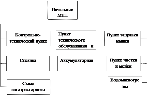 Структура управления МТП является типовой и основные должностные обязанности руководителей подразделений МТП распределены согласно типовым должностным инструкциям МТП. - контрольно-технический пункт (КТП) – контролируют техническое состояние выходящих машин и при их возвращении в парк, а также наличие и правильность оформления документов. КТП размещено в здании у основного выезда машин из парка; - пункт заправки машин – размещен по пути следования машин от КТП к пункту чистки и мойки. Подъездные пути для колесных и гусеничных машин делают раздельные. Пункт заправки оборудован заправочными колонками и подземными резервуарами исходя из недельного запаса горючего с учетом числа и марок, ежедневно эксплуатируемых в парке машин; - пункт чистки и мойки – очистка машины, возвращающейся в парк. Размещен на пути движения машин с пункта заправки и оборудован эстакадами, моечным оборудованием, отстойниками и фильтрами, допускающими многократное использование воды; - пункт технического обслуживания и ремонта (ПТОР) - проводят намеренное техническое обслуживание и ремонт машин. Для ПТОР построено специальное здание и оснащено табельным оборудованием. В помещении ПТОР предусмотрены посты диагностики, электрических, смазочных, регулировочных, слесарных и участки специальных работ – токарных, столярных, сварочных, медницких, обивочных; - водомаслогрейка (ВМГ) – предназначена для нагрева, хранения в горячем состоянии и раздачи охлаждающей жидкости и масла зимой. Необходимое количество жидкости зависит от числа машин, не имеющих пусковых подогревателей и хранящихся в неотапливаемых помещениях; - аккумуляторная – размещается в здании ПТОР и изолирована от других помещений глухими несгораемыми стенами. Аккумуляторная оборудована так, чтобы обеспечить удобство хранения зимой батарей всех машин части, своевременную зарядку, быструю выдачу и доставку батарей к машинам; - стоянка – размещают и хранят машины, выполняют необходимые работы перед выходом из парка и после возвращения в него; - склад автотракторного имущества (АТИ) – принимают, хранят, обрабатывают, ведут учет и выдачу АТИ. Расположено в отапливаемом помещении. Склад оборудован подъемно-погрузочным механизмом и тележками для перевозки грузов по рельсам. Состав машинно-тракторного парка машинно-тракторного парка СПК «БЕЛТА» представлен в таблице 5.