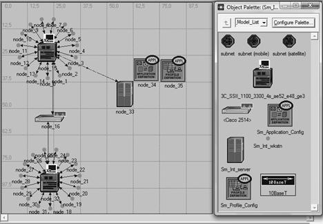 После нажатия клавиши Next, программа предлагает убедиться в правильности введенных данных. После проверки параметров создаваемого проекта и нажатия клавиши Ок появляется рабочая область, где будет создаваться сеть, и палитра, где отображаются элементы, которые можно использовать в проекте (рис. 4). Набор элементов можно изменить путем нажатия клавиши Configure Palette. Элементы на рабочую область можно переносить из палитры. Для этого выделяем элемент в палитре щелчком левой кнопки мыши, вторым аналогичным щелчком, но уже в рабочей области, добавляем элемент в рабочую область. Кроме того, в программе есть возможность создания комбиниро-ванных элементов из шаблонов. Для этого выбираем на панели инструментов Topology -> Rapid Configuration и, следуя пунктам, конфигурируем шаблон. Пример построения офисной сети представ-лен на рис. 5. Сеть расположена на двух этажах, на каждом этаже пользователи подключены к коммутаторам, которые в свою очередь объединены маршрутизатором. Один коммутатор соединен с сервером. Рядом с сервером добавлены элементы, которые определяют тип трафика в сети, и род приложений, работающих в этой сети.
