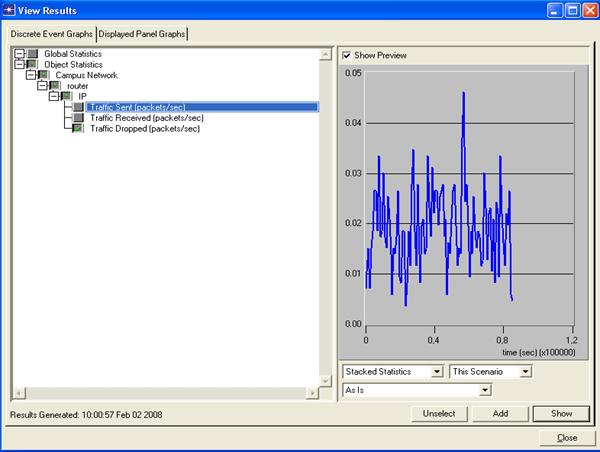После завершения процесса симуляции нагрузку на сеть можно увидеть, перейдя на закладку Simulation Speed (рис. 14). Во время моделирования процессов, происходящих в построен-ной сети, в реальном времени на экране строится график активности, состоящий из двух кривых: синяя отображает ситуацию в каждый момент времени, (время откладывается по оси абсцисс), красная показывает среднее значение. Для просмотра результатов моделирования работы сети «под нагрузкой» выбираем пункт View Result, для этого на рабочей области необходимо кликнуть правой кнопкой мыши и в меню выбрать соответствующий пункт либо нажать на панели инструментов кнопку