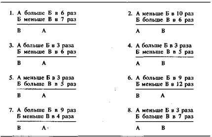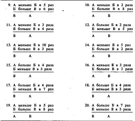 «Логико-количественные отношения» Испытуемым в этой методике предлагается решить 20 задач на выяснение логико-количественных отношений. Все эти задачи представлены далее в таблице 15. В каждой из этих задач необходимо определить, какая величина больше или, соответственно, меньше другой, и результат записать под чертой в виде соотношения между величинами «А» и «В» с помощью знаков «>» или «<». Решать все без исключения задачи нужно только в уме, как можно быстрее и без ошибок. На решение всех 20 задач в целом отводится всего 10 минут. Таблица 15 Задачи к методике «Логико-количественные отношения»