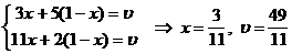 В точках А1 и А2 восстановим перпендикуляр и на полученных прямых будем откладывать выигрыш игроков. На первом перпендикуляре (в данном случае он совпадает с осью 0y) отложим выигрыш игрока 1 при стратегии А1, а на втором – при стратегии А2. Если игрок 1 применит стратегию А1, то выиграет при стратегии В1 игрока 2 – 2, при стратегии В2 – 3, а при стратегии В3 – 11. Числам 2, 3, 11 на оси 0х соответствуют точки В1, В2 и В3. Если же игрок 1 применит стратегию А2, то его выигрыш при стратегии В1 равен 7, при В2 – 5, а при В3 – 2. Эти числа определяют точки В¢1, В2¢, В3¢ на перпендикуляре, восстановленном в точке А2.Соединяя между собой точки В1 и В¢1, В2 и В¢2, В3 и В¢3 получим три прямые, расстояние до которых от оси 0х определяет средний выигрыш при любом сочетании соответствующих стратегий. Например, расстояние от любой точки отрезка В1В¢1 до оси 0х определяет средний выигрыш u1 при любом сочетании стратегий А1 А2 (с частотами х и 1– х) и стратегией В1 игрока 2. Это расстояние равно 2 х1 + 6(1 - х2) = u1 (Вспомните планиметрию и рассмотрите трапецию А1 B1 B¢1 A2). Таким образом, ординаты точек, принадлежащих ломанной В1 M N В¢3 определяют минимальный выигрыш игрока 1 при применении им любых смешанных стратегий. Эта минимальная величина является максимальной в точке N; следовательно этой точке соответствует оптимальная стратегия Х* = (х, 1- х), а её ордината равна цене игры u. Координаты точки N находим как точку пересечения прямых В2 B¢2 и В3 B¢3. Соответствующие два уравнения имеют вид