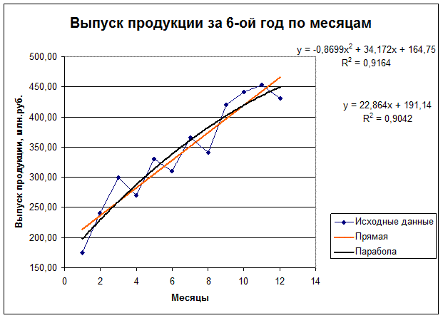 Выделить диаграмму и с помощью приема "захват мышью" переместить ее в конец Рабочего файла. Алгоритм 3.4. Сглаживание ряда динамики выпуска продукции методом аналитического выравнивания с помощью инструмента Мастер диаграмм 1. Выделить мышью диаграмму «Выпуск продукции за 6-ой год по месяцам», расположенную в конце Рабочего файла; 2. Диаграмма => Добавить линию тренда; 3. В появившемся диалоговом окне Линия тренда выбрать вкладку Тип и задать вид линии тренда – линейная; 4. Выбрать вкладку Параметры и выполнить действия: 1. Переключатель Название аппроксимирующей кривой: автоматическое/другое – установить в положение другое и ввести имя тренда - Прямая; 2. Поле Прогноз вперед на – НЕ активизировать; 3. Поле Прогноз назад на – НЕ активизировать; 4. Флажок Пересечение кривой с осью Y в точке – НЕ активизировать; 5. Флажок Показывать уравнение на диаграмме – Активизировать; 6. Флажок Поместить на диаграмму величину достоверности аппроксимации R2 – Активизировать; 7. ОК; 8. Установить курсор на линию тренда, щелкнуть правой клавишей мыши и выбрать меню Формат линии тренда; 9. В появившемся диалоговом окне Формат линии тренда выбрать вкладку Вид и задать по своему усмотрению тип, цвет и толщину линии; 10. ОК; 11. Выделить уравнение линии тренда и индекс детерминации R2 и с помощью приема "захват мышью" вынести их за корреляционное поле. При необходимости уменьшить размер шрифта. 5. Действия 1 – 4 (в п.4 шаги 1–11) выполнить для линии тренда парабола. По окончании работы алгоритма 2.4 выполнить следующие действия: 1. Снять заливку области построения; 2. При необходимости изменить масштаб шкалы осей диаграммы. Результат работы алгоритмов 3.3 – 3.4 для демонстрационного примера представлен на рис.3.4.