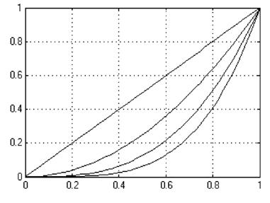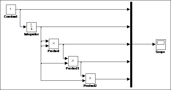Рис. 1.8 Первый вариант структурной схемы виртуального генератора системы степенных базисных функций Первая схема использует каскадное соединение интеграторов. На вход первого интегратора подается сигнал константы 1, на выходе получается Во второй схеме используются система умножителей, последовательно формирующая сигналы степенных функций. На рис 1.10 показана система степенных базисных функций.