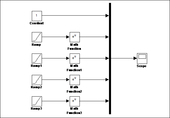 В этой схеме используются 4 одинаковых, последовательно соединенных, блока источника линейного сигнала Ramp и блока математической функции Math Function. С помощью меню параметров решающих блоков задаются различные наклоны линейных сигналов (аргументов экспоненциальных функций) и выбирается тип функции блоков математической функции (в данном случае –