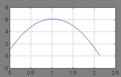 Рис. 3.8 Структурная схема модели траектории камня Начальная высота полета камня задается блоком Constant1, начальная скорость полета задается блоком Gain1, угол наклона полета задается блоком Constant2, ускорение земного тяготения – блоком Gain. Значение текущей высоты полета камня как функции времени формируется на выходе сумматора. Сигнал окончания моделирования формируется блоками Relational Operator и Stop Simulation в момент времени, когда высота Показание цифрового регистратора Display соответствует длине пути по горизонтали, пройденной камнем до момента падения на землю. На рис. 3.9 показана траектория камня на экране виртуального регистратора. На рис. 3.10 показан график изменения во времени высоты полета камня.