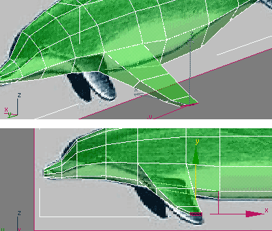 Этот урок для того, что бы понять основные принципы моделирования в 3D Max. Я не объясняю здесь многих подробностей об этом. 2. Активируйте Select And Move tool. Зажав Shift, тяните край направо, создавая копии полигонов.Сделайте это 4 раза, пока не получите полигоны, как на изображении ниже.Потом повторите тот же самый процесс с другой стороны. На этот раз Shift+drag 6 раз. См. изображение ниже. 3. Перейдите на уровень выделения вершин.Передвигайте вершины инструментом Select And Move, чтобы приспособить их к форме тела дельфина. 4. Когда закончите, вернитесь на уровень выделения граней.Выделите все вертикальные грани (для удобства, выделите одну грань и нажмите Ring в свитке модификатора).Далее в свитке Edit Edges нажмите кнопку справа от Connect => 2 сегмента, нажмите ОК. 5. Затем выделите все верхние вертикальные грани. Используйте настройки Connect опять.В этот раз используйте 1 сегмент и значение Slide=-54.Вы получите соединённые края вблизи к верхнему краю. 6. Повторите вышеописанный процесс для создания полосы граней у основания тела. 7. Перейдите на уровень выделения вершин.Двигайте вершины, расположенные в середине тела. Двигайте вершины вдоль оси Х, для получения объема тела вашего дельфина.Этот процесс - утомительный и долгий и требует терпения.Наибольшее перемещение требуется здесь.(как на картинке) 8.Основное тело дельфина закончено. Мы продолжим моделировать плавник и хвост. 9. В левом вьюпорте выделите полигон, как на изображении ниже. 10. В свитке Edit Polygons используйте Bebel 3 раза с разными значениями, чтобы применить его 3 раза. Каждый раз после применения Bebel вы должны приспособить его положение и размер. Также вы можете применить его 3 раза, а потом уже приспособить размер, в таком случае нажимайте Apply а не OK). 11. Затем сделаем спинной плавник. Измените выделение на Edge(кнопка 2). Выделите одну грань, как на изображении ниже.Зажав Shift тяните её три раза, чтобы создать полигоны. Подвиньте вершины так, чтобы соответствовать референсу. 12. В следующем шаге мы придадим глубину этому плавнику. Выделите горизонтальные грани в дельфиньем плавнике.Опять используйте настройки Connect. Параметры использования на изображении ниже. 13. Теперь перейдите на уровень выделения вершин.Двигайте вершины в середине (по оси Х), чтобы придать глубину плавнику. 14. В следующем шаге мы создадим хвост. Измените выделение на полигоны. В виде Left выделите 6 полигонов в части основания хвоста дельфина. Используйте Extrude 3 раза. Каждый раз Вы добавляя вытеснение, регулируйте вершины, чтобы сформировать хвост. См. на изображение ниже. 15. Теперь мы сделаем дельфинью голову.В виде Left выделите все горизонтальные грани, как изображении ниже. Используйте такие настройки Connect'a: Segments=2, и Pinch=65. 16. Перейдите на уровень выделения вершин. Двигайте вершины так, чтобы создать объём носа.Кроме того,немного подвиньте вершины в областях, показанных стрелками. Для носа дельфина я добавляю длину, отличающуюся от изображения проекта. 17. Далее мы продолжим формировать голову дельфина.Выделите все горизонтальные грани, как на изображении ниже. Используйте Connect со значением 1. Двигайте вершины, чтобы придать голове дельфина больший объём и округленность. 18. Сейчас мы сделаем глаз.Выделите одну вершину в глазной области. Используйте Chamfer, чтобы создать квадратную область. Затем выделите все грани в этой квадратной области. Используйте Extrude с