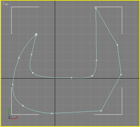 Перейдем к созданию последнего элемента модели — ручки. Поскольку этот элемент имеет осевую симметрию, создавать его будем как трехмерный объект, образованный вращением сплайнового профиля вокруг оси. Как вы помните, для этого используется модификатор Lathe (Вращение вокруг оси). Для создания ручки консервного ножа переключитесь в окно проекции Тор (Сверху) и с помощью инструмента Line (Линия) создайте кривую, показанную на рис. 3.89. При необходимости измените характер излома вершин так, как описано выше.