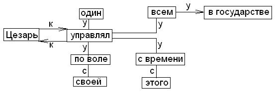 Из таблицы видно, что наибольшая лок. степень у вершины E: P(E)=4, у всех остальных вершин лок. степень равна 3. Для того чтобы включенную в структуру модель представить в виде графа не структурную (количественную или текстовую) информацию довольно часто любому ребру (или любой вершине) рассматриваемого графа приписывают некоторый вес. Граф, ребра (вершина) которого приписаны весу, называется взвешенными. Вес неудобно располагать на чертеже и схеме, поэтому взвешенный граф лучше представить в виде матрицы, такие матрицы называются матрицами весовых соотношений. Пример: Составить взвешенный граф предложения: “С этого времени Цезарь один управлял всем в государстве по своей воле”. В этом графе вершинами будут члены предложения, дуги синтетической связи между ними, причем вес приписан и вершинам и дугам, чтобы указать направление дуги в матрице используется знак “+” и “-“ (“+” - главное слово, “-“ -зависимое) связи, которую нужно отразить. у – управление с – согласные к – координация