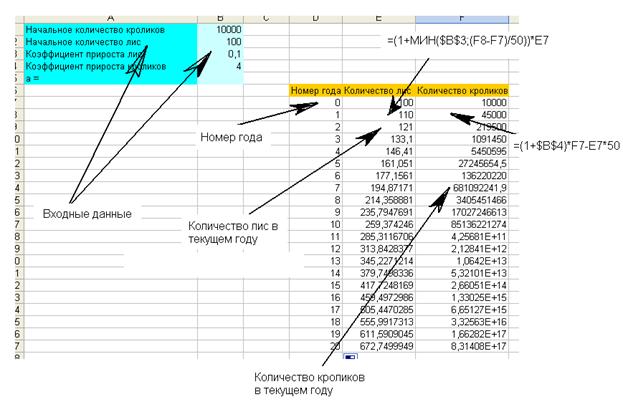 На рисунке видно, что в ячейки B1-B4 вводим исходные данные. В ячейку E8 вводим формулу =(1+МИН($B$3;(F8-F7)/50))*E7 затем растягиваем ячейки вниз на необходимое количество лет (в данном примере 21 год; от 0 до 20). В ячейку =(1+$B$4)*F7-E7*50 и аналогично растягиваем. В результате в ячейках E7-E27 получим количество лис в соответствующих справа годах. В F7-F27 – количество кроликов. Например, видно, что при начальном количестве кроликов = 10000, при количестве лис = 100, и коэффициентах роста для кроликов = 4 и лис =0,1 количество кроликов через 10 лет будет 85136221274 а лис 259.