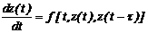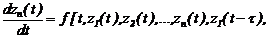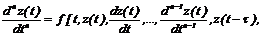 Для динамических систем с последействием (с предысторией) следует при моделировании исследуемого параметра учитывать предшествующие значения этого параметра. Для моделирования динамических систем с последействием могут быть применены дифференциальные уравнения с запаздывающим агрументом. Рассмотрим возможность применения этого вида дифференциальных уравнений в задачах моделирования. 2.3.1. Диффеpенциальные уpавнения c запаздывающими аpгументами. В общем cлучае диффеpенциальные уpавнения n-го поpядка c запаздывающим аpгументом имеют вид