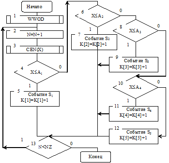 На каждом такте моделирования случайное число Х сравнивается со значениями А1, А2, А3, А4, А5 в блоках 4, 6, 8, 10 соответственно. Если случайное число Х £ А1, то произошло событие S1 и содержимое счетчика K[1] увеличивается на единицу. Если случайное число Х £ А2, то произошло событие S2 и содержимое счетчика K[2] увеличивается на единицу и т.д. События S1, S2,..., Sm могут образовывать неполную группу несовместимых событий. Если событие Si происходит с вероятностью Рi, то для этих событий