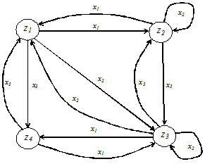 На пересечении i -й строки и j -го столбца табл. 2.1 указывается то состояние z(t), в которое перейдет автомат в такте времени t, при условии нахождения автомата в предшествующем такте t‑1 в состоянии zj(t‑1) и подачи в этом такте t входного сигнала xi(t). На рис. 2.7 приведено задание данного автомата в виде графа.