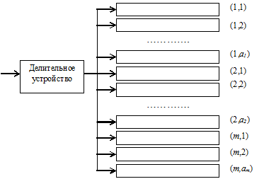 Рис. 2.8 За один такт движения подающего устройства становится известным диаметр di, Для обработки труб диаметром di имеется технологическая группа из ai линий. Линии обозначены в виде двоек (i,k), где i ¾ номер группы, k ¾ номер линии в группе, Пусть загружена линия (i, pk) в момент времени tj. При поступлении в такте tj +1 трубы диаметром di она будет направлена в линию (i, pk+1), если k < ai, или в линию (i, 1), если k = ai. Предлагается разработать модель в виде конечного автомата при m =3, а1 =2, а2 =3, а3 =2. Решение. Автоматную модель зададим в виде набора A =< X, Y, Z, φ, ψ, z0 >. Множество входных сигналов представим в виде X ={ x1, x2, x3 }, где xi ¾ сигнал, свидетельствующий о поступлении на вход ДУ трубы диаметром di. Выходной сигнал определяется множеством двоек Y ={(i, pk)}, i =1,2,3, k =1, ai и указывает, в какую линию i -й группы должна быть направлена труба. Множество состояний z содержит a1 × a2 × a3 =12 векторов Z ={ z1, z2, z3 }, причем zi есть номер занятой pk линии в i -й группе. Функцию переходов φ(t) определеим в виде выражения