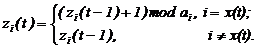 Функцию выходов φ(t) зададим в виде y(t) ={ x(t), [(zx (t ‑1)+1) modax ]}, где под zx понимается координата zi при i = x(t). Задание функции переходов приведено в табл. 2.3. Задание функции выходов приведно в табл. 2.4. Под состоянием z0 в начальный момент времени t0 можно понимать вектор z0 =(0,0,0). Рассмотрим построение модели автоматического склада. Склад представляет хранилище из m стеллажей. На каждом из стеллажей хранятся изделия i -й номенклатуры,