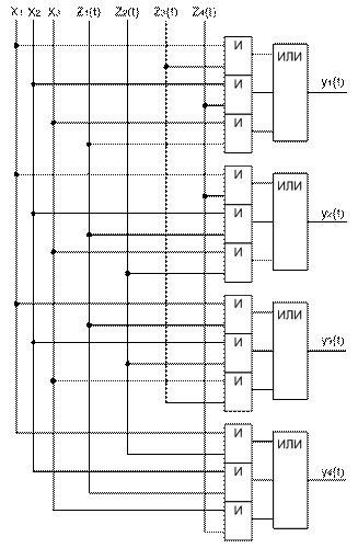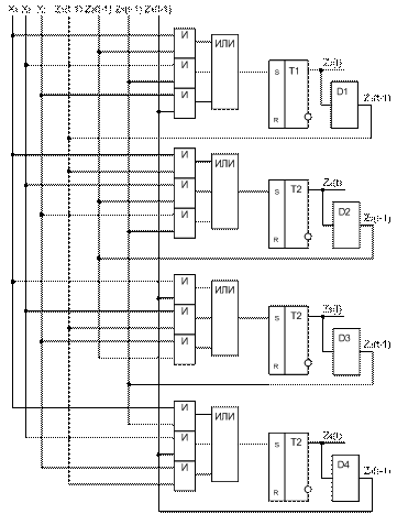 Решение. Модель представим в виде автомата A =< X, Y, Z, φ, ψ, z0 >. Множество входных сигналов представим в виде (m +1)-мерного вектора X ={ x1, x2, x3, …, xm, μ }, где μ =+1 при поступлении xi изделий i -й номенклатуры на склад, μ = ‑1 при выдаче xi изделий со склада. Множество состояний Z есть также вектор Z ={ z1, z2, …, zm }, где zi ¾ количество изделий i -й номенклатуры на складе (остаток изделий). Множество выходных сигналов Y будет совпадать с множеством Z. Функцию переходов формально опишем в следующем виде: zi(t) = zi(t-1)+mxi(t), Функцию выходов y(t) для автомата определим в виде yi(t) = zi(t). Табличное задание функции переходов φ(t) не приводится из-за большой мощности множества Z. Рассмотрим синтез дискретной логической схемы для рассмотренного выше примера задания конечного автомата при X={x1,x2,x3}, Z={z1,z2,z3,z4} и Y={y1,y2,y3,y4}, задании функции пеpеxодов в виде табл. 2.1, а функции выходов в виде табл. 2.2. Определим из табл. 2.1 вид функций алгебры логики, задающих переход автомата в состояние zi(t). Fz1(t) = x1 Ù z2(t‑1) Ú x2 Ù z3(t-1) Ú x3 Ù z4(t-1); Fz2(t) = x1 Ù z1(t‑1) Ú x2 Ù z2(t-1) Ú x3 Ù z3(t-1); Fz3(t) = x1 Ù z4(t‑1) Ú x2 Ù z1(t-1) Ú x3 Ù z2(t-1); Fz4(t) = x1 Ù z3(t‑1) Ú x2 Ù z4(t-1) Ú x3 Ù z1(t-1). Определим из табл. 2.2 вид функций алгебры логики, задающих изменение выходного сигнала автомата yj(t): Fy1(t) = x1 Ù z3(t) Ú x2 Ù z4(t) Ú x3 Ù z1(t); Fy2(t) = x1 Ù z4(t) Ú x2 Ù z1(t) Ú x3 Ù z2(t); Fy3(t) = x1 Ù z1(t) Ú x2 Ù z2(t) Ú x3 Ù z3(t); Fy4(t) = x1 Ù z2(t) Ú x2 Ù z1(t) Ú x3 Ù z4(t). Операции коньюнкция соответствует элемент И, а операции дизьюнкция ¾ элемент ИЛИ. На рис. 2.9 приведена функциональная схема, реализующая функцию переходов автомата z(t) = j [ z(t‑1), x(t) ]. На рис. 2.10 приведена функциональная схема, реализующая функцию выходов автомата y(t) = y [ z(t‑1), x(t) ]. На рис. 2.9 триггер Т i устанавливается в единицу, если истинная функция алгебры логики Fzi(t). D-триггеры представляют собой элементы задержки на один такт. На рис. 2.9 не приведены цепи синхронизации, определяющие сброс триггеров Т i в нулевое состояние.