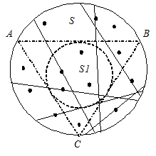 Из результатов опыта следует, что вероятность того, что сторона случайным образом проведенной хорды будет больше стороны правильного вписанного в окружность треугольника, определится из соотношения CD / EF. Это отношение равно 0,5, т.е. вероятность равна 0,5. Вариант 3. Представим, что повержность окружности помазана медом, на который садятся и прилипают мухи, как показано на рис. 3.4. Мухи садятся на мёд случайным образом, и на окружности площади S будет, в общем случае, бесконечно множество точек. Если проводить хорду через точку, находящуюся внутри окружности с площадью S1, то её длина будет превышать длину стороны правильного вписанного треугольника ACB.