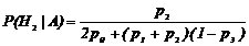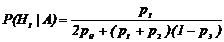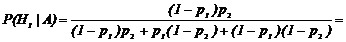 3.4.1. Модель отказа прибора. Прибор состоит из двух блоков, которые определяют его безотказную работа. Вероятность безотказной работы первого блока равна p1, а второго — p2. Прибор испытывался в течение заданного времени Т, в результате чего обнаружено, что он вышел из строя. Найти вероятность того, что отказал только первый блок, в второй исправен. Решение. Модель отказов работы прибора определена следующими гипотезами: H0 ={оба узла исправны}; H1 ={первый узел отказал, а второй исправен}; H2 ={первый узел исправен, а второй отказал}; H3 ={оба узла отказали}. Вероятности гипотез: P (H0)= p1p2; P (H1)=(1‑ p1) p2; P (H2)= p1 (1‑ p2); P (H3)=(1‑ p1)(1‑ p2). Событие А состоит в том, что прибор отказал. В результате получаем вероятности: P (А/ H0)= p1p2; P (А/ H1)= P (А/ H2)= P (А/ H3)=1. Согласно формуле Бейеса, модель отказа первого блока и исправности второго блока прибора определится по формуле