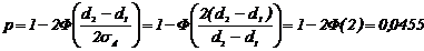 Математическое ожидание времени пуска M [ T ]= tM [ X ]= t/p. Дисперсия распределения определится D [ T ]= t2D [ X ]= t2q/p2. 3.4.4. Модель браковки шариков. Браковка шариков для подшипников проводится следующим образом. Если шарик не проходит через отверствие диаметром d1, но проходит через отверствие диаметром d2 > d1, то его размер считается приемлемым. Если какое-нибудь из этих условий не выполняется, то шарик бракуется. Известно, что диаметр шарика D есть нормально распределенная случайная величина с характеристиками md =(d1 + d2)/2 и sd =(d2 ‑ d1)/4. Найти модель, описывающую вероятность p того, что шарик будет забракован. Решение. Участок значений (d1, d2) симметричен относительно md. По формуле P {| X ‑ md |< l }=2 Ф (l / s), где l= (d2 ‑ d1)/2 — половина длины участка, находим вероятность того, что шарик не будет забракован: P {| D ‑ md |<(d2 ‑ d1)/2}= Тогда вероятность p определится по формуле