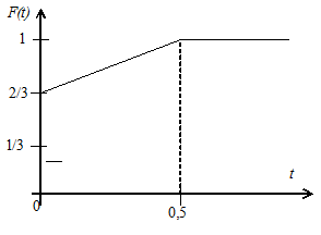 3.4.5. Модель проезда через регулируемый перекресток. На перекрестке стоит автоматический светофор, в котором одну минуту горит зеленый свет и половину минуты — красный, затем опять одну минуту горит зеленый свет и половину минуты — красный и т.д. Найти модель, отображающую вероятность проезда светофора при условии, что момент проезда автомашины через перекресток распределен равномерно в интервале, равном периоду смены цветов в светофоре. Решение. Период смены цветов в светофоре раве 1+0,5=1,5 мин. Для того чтобы машина проехала через перекресток, не останавливаясь, достаточно, чтобы момент проезда перекрестка пришелся на интервал времени (0; 1). Для случайной величины, равномерно распределенной в интервале (0; 1,5),), вероятность того, что она попадет на участок (0; 1), равна 2/3. Время ожидания Тож есть смешанная случайная величина; с вероятностью 2/3 она равна нулю, а с вероятностью 1/3 принимает с одинаковой плотностью вероятности любое значение между 0 и 0,5 мин. График функции распределения показан на рис. 3.8. Среднее время ожидания у перекрестка определится по формуле М [ Тож ]=0×2/3+0,25×1/3»0,083 мин.