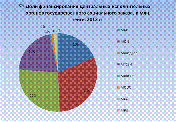 Если в 2010 году 81% всего государственного социального заказа приходился на долю министерства культуры и информации, то в 2012 году на долю того же министерства пришлось 19%. Тенденция такова, что происходит постепенный отток концентрации государственного социального заказа из одного государственного органа в сторону равномерного распределения между всей исполнительной вертикалью власти центрального уровня. Этому способствовал переформатирование системы государственного управления на принципы стратегического планирования. Министерство культуры и информации до 2011 года государственный социальный заказ распределяло по всем предусмотренным направлениям, в законе о государственном социальном заказе, в том числе и по тем направлениям, которые не входят в компетенцию данного государственного органа. Новая система государственного управления на основе стратегического планирования предписывает государственным органам придерживаться своего функционального назначения. В связи с чем, как отметил вице-министр культуры РК Газиз Телебаев в ходе заседания Координационного совета по взаимодействию с НПО при Правительстве РК в 2010 году - «При формировании бюджета нашего ведомства на следующие и последующие годы Министерством культуры уже не учитываются некоторые направления. Не потому, что мы не хотим, а потому, что нам запрещают Министерство финансов, Министерство экономического развития и торговли, и правильно, наверное». В результате чего, объем государственного социального заказа предусмотренный министерством культуры и информации в 2011 и 2012 годы снизился более чем в два раза сравнительно с 2010 годом. Следующим фактором для развития отраслевого государственного социального заказа послужило принятие в 2011 году закона «О внесении изменений и дополнений в некоторые законодательные акты Республики Казахстан по вопросам государственного социального заказа». Данный закон совершенствовал систему выделения государственного социального заказа. Если раньше центральные государственные органы не спешили размещать государственный социальный заказ, аргументируя несовершенством законодательной базы, сейчас они готовы вовлекать НПО в реализацию социальной политики. Если, например, до 2011 года только 4 центральных государственных органа (МКИ, МОН, МТСЗН и Минюст) выделяли государственный социальный заказ, то в 2012 году их стало уже 10. Другими словами, на 2012 год приходится пик развития отраслевого государственного социального заказа. Лидером по объему выделенных средств стало министерство образования и науки (31%), далее следуют министерства здравоохранения (27%), труда и социальной защиты населения (20%) и культуры и информации (19%) от общего объема государственного социального заказа. По одному проценту от общего объема выделены министерствами юстиции, охраны окружающей среды и агентством по делам туризма и спорта. Меньше одного процента выделили агентство РК по делам религий, министерства внутренних дел и сельского хозяйства. Наименьшая сумма выделенного государственного социального заказа в 2012 году у министерства сельского хозяйства, которая составила 793 тыс. тенге. Выделение значительных средств на реализацию государственного социального заказа в свою очередь накладывает отвественность за его эффективную реализацию, ц