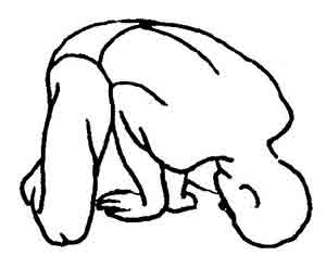 Техника выполнения. Встать на колени, а затем сесть на пятки. Развести колени пошире и положить ладони на пол между ногами пальцами в направлении промежности. Мизинцы соединены, пальцы слегка разведены и чуть-чуть присогнуты (рис.2-25.1).