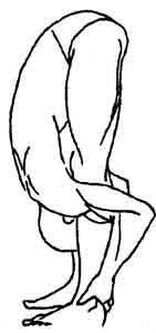 Вдохнуть. Выдыхая, продолжить опускание туловища, стараясь коснуться кистями рук пальцев ног. Захватить себя руками за голени и со вдохом вытянуть позвоночник вперед, прогнувшись как можно больше назад-вверх.
