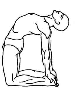 рис.2-39.1 рис.2-39.2 Когда руки окажутся полностью выпрямленными, проделать поднятие туловища за счет поднимания передней части грудной клетки. В итоге туловище вытягивается по плавной дуге, позвоночник удлиняется, равномерно до предела прогибаясь назад во всех отделах, грудная клетка расправлена, плечи отведены в стороны и назад. Голову не запрокидывать, а отводить как можно дальше назад, вытягивая шею по кривой, продолжающей плавную дугу позвоночника (рис.2-39.2). Тот, кому сложно принять это положение опираясь о ступни, может захватить руками лодыжки одноименных ног. Задержав дыхание после выдоха, оставаться в асане 10—15 секунд. Со вдохом вернуться в исходное положение — сидя на пятках. Повторить еще два раза.
