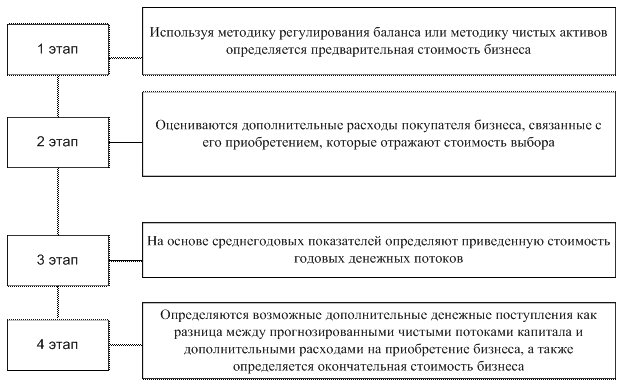 10.4 Метод оценки стоимости бизнеса Метод оценки стоимости бизнеса на базе опционов является модификацией стандартного метода дисконтирования денежных потоков, но с учётом возможных изменений стратегических ориентиров и утверждения новых управленческих решений по мере поступления дополнительной информации. Используется при определении стоимости стратегической и оперативной гибкости производственно-коммерческой системы. Опционы могут быть включены в баланс предприятия как в виде активов так и в виде пассивов. Опционы на стороне активов обеспечивают гибкость и создают добавочную стоимость бизнеса только при условии превышения их экономических результатов над затратами по заключению и выполнению. Опционы на стороне пассивов оказывают существенное влияние на показатель средневзвешенных расходов на капитал. Метод дисконтирования денежных потоков базируется на постулате, что потенциальный инвестор платит не за набор средств труда, команду работников, совокупность прав на интеллектуальную собственность и т.п., а за конечный поток средств (капитала). Этот метод оценки не используется при условии систематической убыточности деятельности предприятия, а также при оценке новых видов бизнеса.