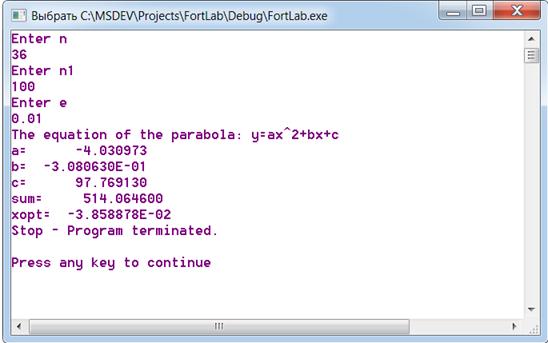 4. ТЕКСТ ПРОГРАММЫ program parabola integer n, i!Размерность массивов данных, переменная цикла. real x1(36), y1(36)!Объявление массивов: таблично заданная функция. real y, xy, x2y, x2, x3, x4, x!Подразумеваются соответствующие суммы. real det,det1,det2,det3,a,b,c,sum,xopt write(*,*) 'Enter n' read*, n open(1,file='x.txt')!Файл с набором значений аргумента. read(1,*) x1!(Число точек должно соответствовать n). open(1,file='y.txt')!Файл с набором значений функции. read(1,*) y1 y=0.0!Предварительно присваиваем нулевые значения суммам. xy=0.0 x2y=0.0 x2=0.0 x3=0.0 x4=0.0 x=0.0 do i=1,n!Находим суммы. y=y+y1(i) xy=xy+x1(i)*y1(i) x2y=x2y+x1(i)*x1(i)*y1(i) x2=x2+x1(i)*x1(i) x3=x3+x1(i)*x1(i)*x1(i) x4=x4+x1(i)*x1(i)*x1(i)*x1(i) x=x+x1(i) enddo det=x4*x2*n+x3*x2*x+x3*x2*x-x2*x2*x2-x3*x3*n-x*x*x4!Вычисление определителей. det1=x2y*x2*n+xy*x2*x+y*x3*x-y*x2*x2-xy*x3*n-x*x*x2y! (Метод Крамера) det2=x4*xy*n+x2y*x*x2+x3*y*x2-x2*xy*x2-x3*x2y*n-y*x*x4 det3=x4*x2*y+x3*xy*x2+x3*x*x2y-x2*x2*x2y-x3*x3*y-x*xy*x4 a=det1/det!Находим коэффициенты параболы b=det2/det c=det3/det sum=sum1(a,b,c) xopt=xopt1(a,b,c) write(*,*)'The equation of the parabola: y=ax^2+bx+c'!Вывод коэффициентов на дисплей. write(*,*)'a=',a write(*,*)'b=',b write(*,*)'c=',c write(*,*)'sum=',sum write(*,*)'xopt=',xopt stop end
