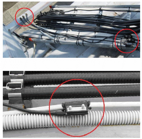 Кабель питания разрешается укладывать открыто, и крепить атмосфероустойчивыми либо металлопластиковыми стяжками. При длине трассы до 60 м разрешается прокладка кабеля сечением 6 мм2, а при длине трассы от 60 м до 100м только кабель сечением 10 мм2. Разрешается применение только экранированных кабелей. Для электроснабжения радио-блоков RRUS используется не оконченный кабель, в связи с чем, для обеспечения защитного заземления и молниезащиты необходимо заземлять оплётку кабеля как минимум в двух местах (требования к установке такое же - как к любым фидерным кабелям) - около RRUS (0,5…1,0 м перед RRUW) и перед вводом в аппаратную (0,5…1,0 м от ввода кабеля в аппаратную). Количество и места установки заземляющих устройств должны быть отображены в проектной документации. Заземляющие устройства монтируются только на прямолинейных участках кабеля питания. Запрещается установка заземляющих устройств на изгибе кабеля питания. Токоотводы заземляющих устройств соединяются с магистралью заземления, при этом тоководы должны быть направлены вдоль кабеля питания под углом не более 30o по направлению от антенны к аппаратной и не должны иметь перегибов, скручивании, колец и т.д. Крепление болтов заземления к магистрали для присоединения тоководов заземляющих устройств необходимо выполнять посредством сварки. Место сварки должно быть зачищено. В случае, если условия сайта не позволяю выполнить сварочные работы допускается выполнить соединение другим способом, обеспечивающим надежный контакт, например: · в плоских проводниках магистрали может быть просверлено отверстие под болт заземления (места контакта должны быть зачищены от ржавчины и краски и при этом допускается присоединение только одного заземляющего провода на один болт); · в случае если магистраль заземления выполнена стальным проводником круглого сечения, могут использоваться крестовые зажимы с учетом выполнения условий совместимости различных металлов исключающих электрохимическую коррозию. Примеры крестовых зажимов: