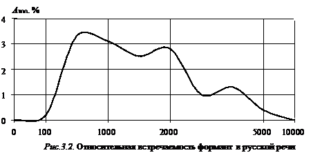 Одной из важнейших характеристик речи является ее формантный спектр. В процессе формирования звуков воздушные струи встречают на своем пути систему резонаторов, которые образуются воздушными объемами полости рта и носоглотки. Они видоизменяются в процессе произнесения различных звуков положением языка и зубов. Проходя через эту систему резонаторов, одни гармонические составляющие получают усиление, а другие, наоборот, подавляются. Области концентрации энергии в частотном диапазоне, получающиеся при произнесении какого либо звука речи, и носят название формант. Каждый звук речи имеет несколько формант. Форманты полностью заполняют частотный диапазон речи. В нем нет промежутков, форманты располагаются не только вплотную, но даже перекрывают друг друга. Как часто встречаются форманты в различных участках речевого диапазона, зависит от статистической частоты повторения звука речи. Формантная структура звука мало зависит от особенностей голоса, но определяется языковыми конструкциями. Для русского языка, как это видно из кривой A=φ(f)приведенной на рис. 3.2, характерно наличие трех ярко выраженных формантных областей (для английского языка, например, существуют две формантные области). Каждая ордината кривой представляет собой относительное число формантных составляющих, содержащихся в полосе шириной 100 Гц, отложенное по средней частоте этой полосы, если общее число формант во всем речевом спектре принять за единицу. Поскольку форманты значительно мощнее других составляющих, то они-то главным образом и воздействуют на ухо слушающего, формируя звучание того или иного звука, а разборчивость передаваемой речи зависит, прежде всего, от того, какая часть формант дошла до уха слушающего без искажений.