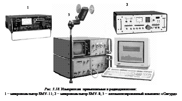 Таким образом, в расчеты уровня допустимого акустического давления в месте установки ТС вносится дополнительная (объектовая) поправка. Напряженности электрического и магнитного полей низкой частоты, создаваемые в пространстве окружающем ТС за счет микрофонного эффекта, бывают, как правило, незначительные. При необходимости, измерения производятся по аналогии с линейными измерениями, но с использованием низкочастотных антенн, подключенных на вход измерителя. Расчет ослабления низкочастотного поля излучения до границы контролируемой зоны производится в соответствии с методикой, изложенной в следующем разделе. 3.2.3.2. Измерения и расчет параметров модулированных высокочастотных колебаний ТС. Задача измерений в радиодиапазоне в первом случае сводится к определению коэффициентов модуляций побочных линейных сигналов или излучений, возникающих при работе различных генераторов, входящих в состав ТС, или из-за паразитных генераций в электронных схемах ТС. Далее производится расчет допустимого уровня акустического давления речевого сигнала в месте установки ТС, когда обеспечивается невозможность восстановления из модулированного колебания информативного сигнала. Задача измерений в радиодиапазоне во втором случае сводится к определению отношений модулированный сигнал (излучение)/шум на границе контролируемой зоны. Далее делается вывод о защищенности ТС, либо производится расчет дополнительно необходимых размеров контролируемой зоны, когда обеспечивается невозможность восстановления информативного сигнала из смеси сигнала и помехи В качестве измерителей используются селективные микровольтметры и анализаторы спектра, или измерительные комплексы, по примеру приведенных на рис. 3.18.