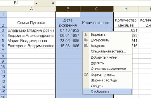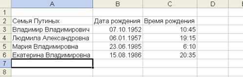 Выполнение работы В качестве примера возьмём семью президента. Путин В.В. -07.10.52, Путина Л.А. – 06.01.1957. Путина М.В.- 23.06.1985, Путина Е.В. – 15.08.1986. Время рождения поставим произвольно. Заполнение таблицы проводим в соответствии с пунктами задания. 1.