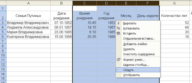 Таблица становится трудно читаемой. Скроем на экране столбцы C, D, E, F. Выделим скрываемые столбцы. Правой кнопкой вызовем контекстное меню - Скрыть