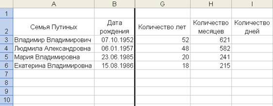 3. Решение следующих пунктов задач делает таблицу очень широкой, и имеет смысл укоротить ширину столбцов, переформатировать заголовки. Вычисляем количество прожитых лет семьи. Один из вариантов – год сегодняшний минус год рождения и отформатировать ячейку на числовой формат.