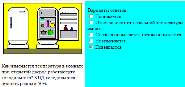 Решение: Поскольку КПД любого прибора всегда менее 100%, в результате его работы в замкнутой системе в среднем будет происходить отдача им тепла этой системе. Конкретное значение КПД при этом не играет никакой роли. Так что в общем случае ответ для любого прибора – повышается. Но с холодильником вопрос осложняется тем, что его начальная температура может быть ниже комнатной, и тогда после открытия дверцы может происходить кратковременное уменьшение температуры комнаты, с последующим её повышением. Однако среди ответов такой вариант отсутствует, поэтому вариант “Ответ зависит от начальной температуры комнаты” не является правильным. Правильный ответ – “Повышается”. Остальные вопросы теста имеют аналогичный уровень сложности, в большинстве -не очень высокий. Следует учесть, что тест разрешалось проходить произвольное число раз без начисления штрафных баллов. Поэтому большинство учащихся в итоге получили за него высокие баллы. Date: 2015-07-17; view: 1641; Нарушение авторских прав |