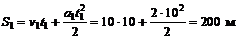 Решение. Применяя формулу скорости для равноускоренного движения в течение времени t1, получим откуда Находим путь, пройденный на участке разгона: Скорость при торможении машины меняется по формуле v = v2 – a2t, (1) убывая за время t2 до v = 0. Подставляя нуль в правую часть уравнения (1), и выражая величину ускорения, получаем Отметим, что в данном случае проекция ускорения на ось OX отрицательна: a2x = —a2 = –1 м/с2. Соответствующий путь составляет Ответ: a1 = 2 м/с2, S1 = 200 м, a2 = 1 м/с2 (a2x = –1 м/с2), S2 = 450 м.